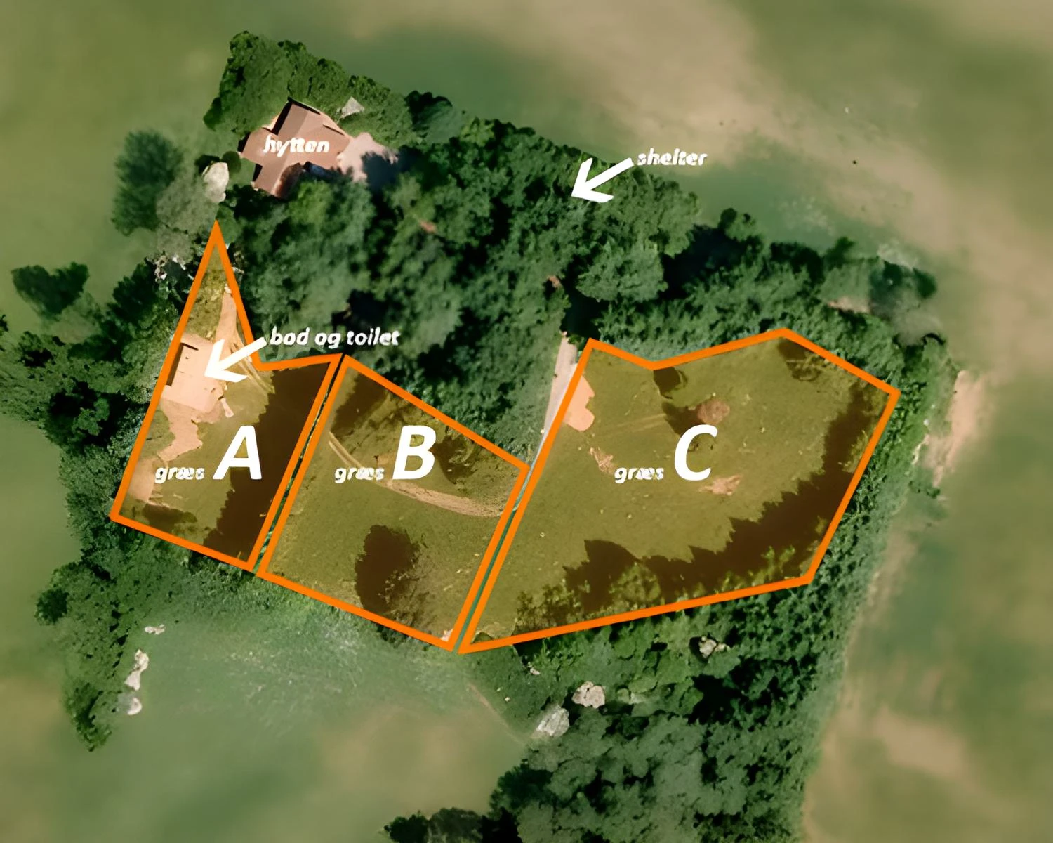Man kan sætte sit telt på Græs A og sin campingvogn på Græs B. Der er bad og toilet i hytten og ved Græs A.
